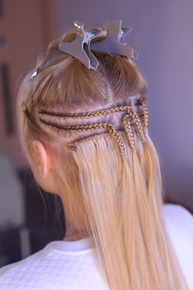 The sewn - on hair extension technology uses hair wefts (the hair sewn into the braid). With the hair extension sewn - on technology from the client’s own hair 1-3 French braids can be plaited (1-2 braids from the highest ear point until the highest point of the other ear and 1 or 2 braids from the average point of the ear until the average point of the second ear one straight under the other). When these braids are plaited, the hairstylist with the thread and a needle sews the hair weft to these braids.