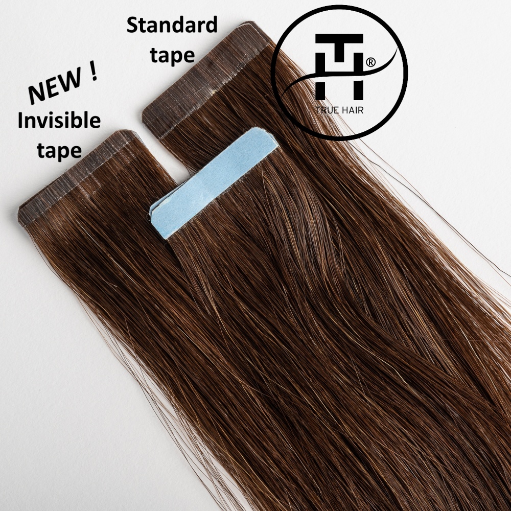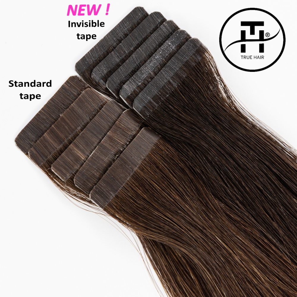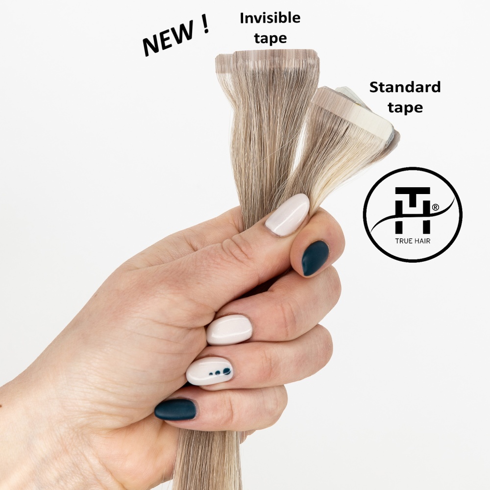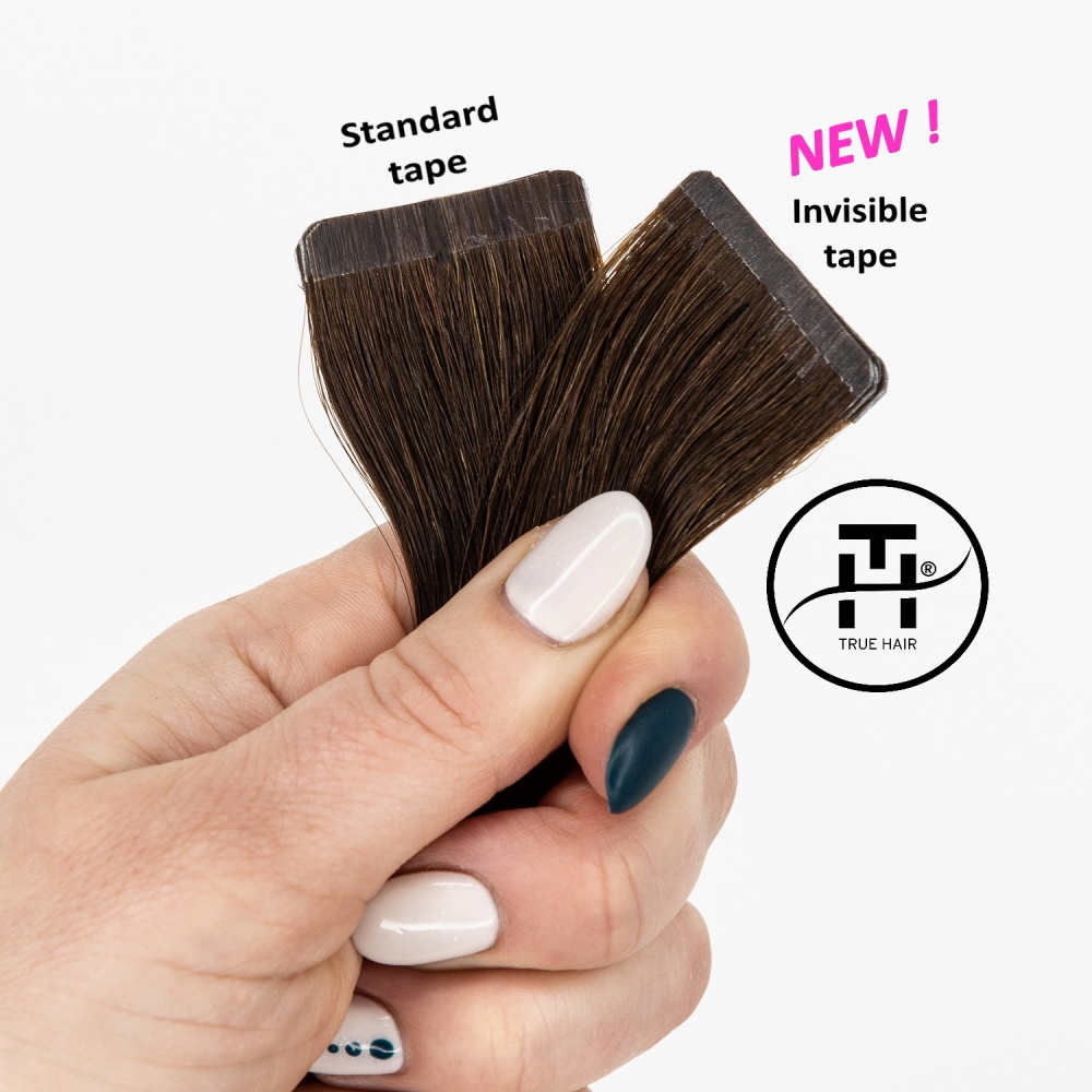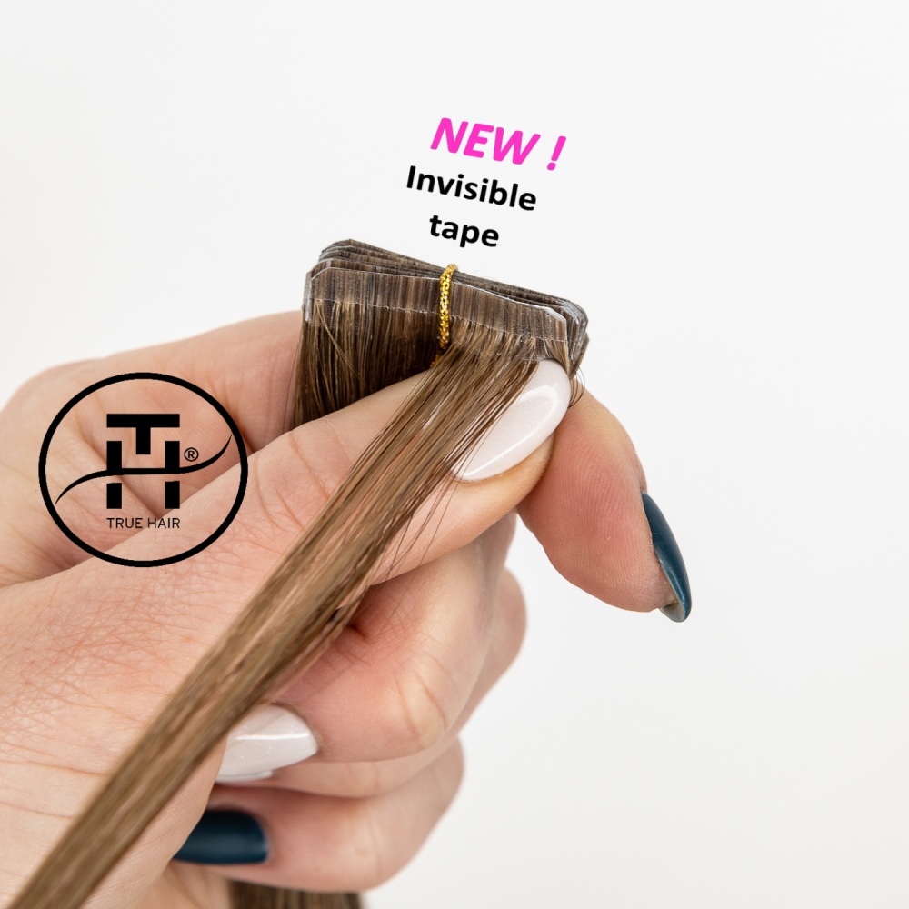 TRUE HAIR – true hair for true quality lovers… Invisible tape differs from regular format tape in that it has a smaller height 3 mm. Such a tape is almost invisible from the side. The tapes are glued (polyurethane-based) and sealed for reliability using a thermal machine. The tape base has a hair color for dark and medium shades, which makes True Hair extension tapes invisible. There is an polyester adhesive (scotch) on the tapes. It is no allergic and can be easily removed with alcohol-containing fluid for removing. True Hair Ivisible tapes tapes are very neat without causing hair to be pulled out and can be moved up repeatedly in case of careful use.