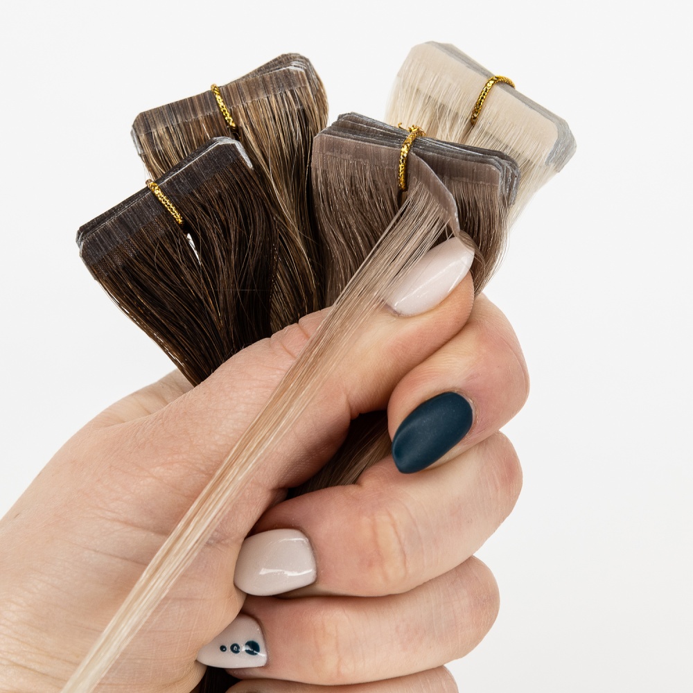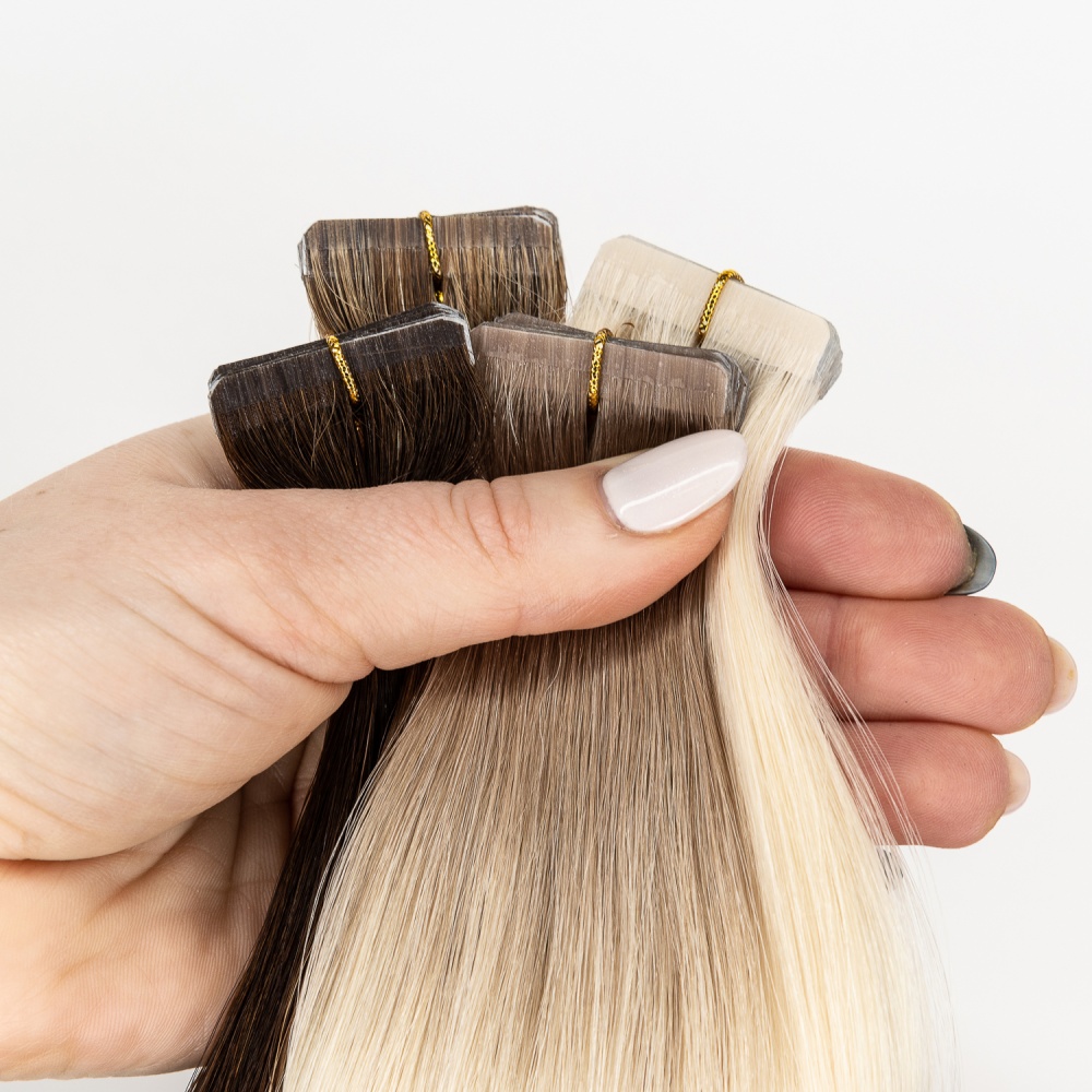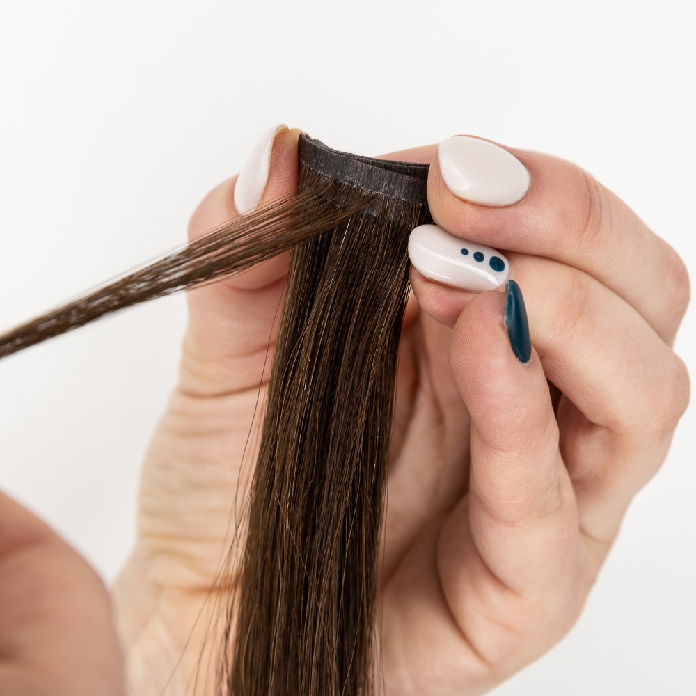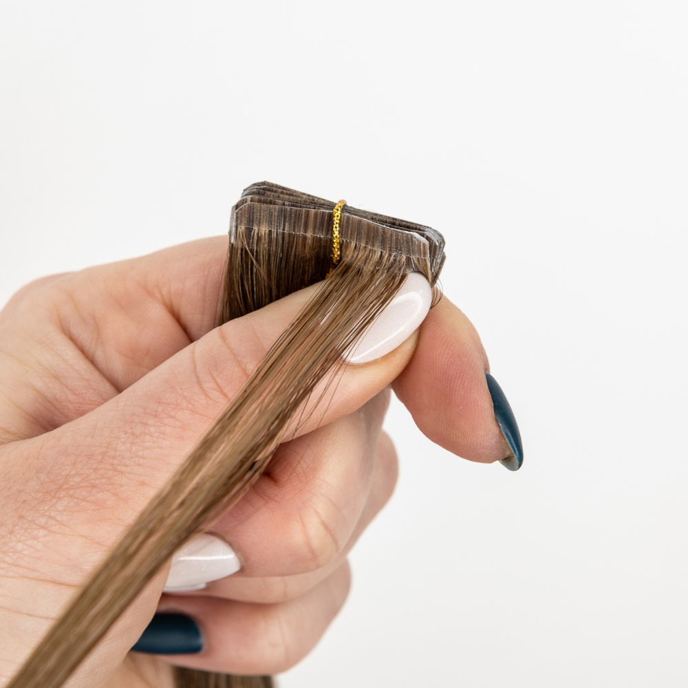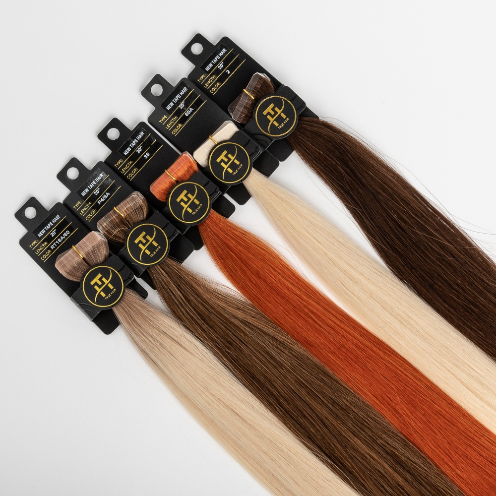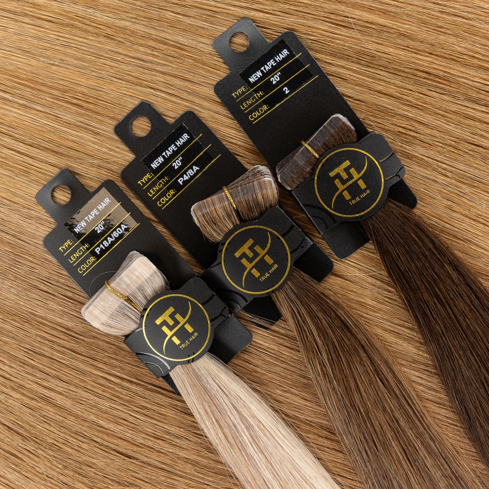 TRUE HAIR – true hair for true quality lovers… Invisible tape differs from regular format tape in that it has a smaller height 3 mm. Such a tape is almost invisible from the side. The tapes are glued (polyurethane-based) and sealed for reliability using a thermal machine. The tape base has a hair color for dark and medium shades, which makes True Hair extension tapes invisible. There is an polyester adhesive (scotch) on the tapes. It is no allergic and can be easily removed with alcohol-containing fluid for removing. True Hair Ivisible tapes tapes are very neat without causing hair to be pulled out and can be moved up repeatedly in case of careful use.